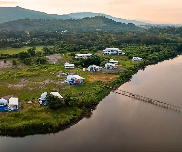 Monty’s sits along a calm river just outside San Antonio, close to San Miguel Beach and a short drive from the coast. The setup is simple: pool, small restaurant and bar, trees everywhere. Monty himself is usually around, and the vibe is more like staying with a local than checking into a resort. Not flashy, but genuinely relaxing.